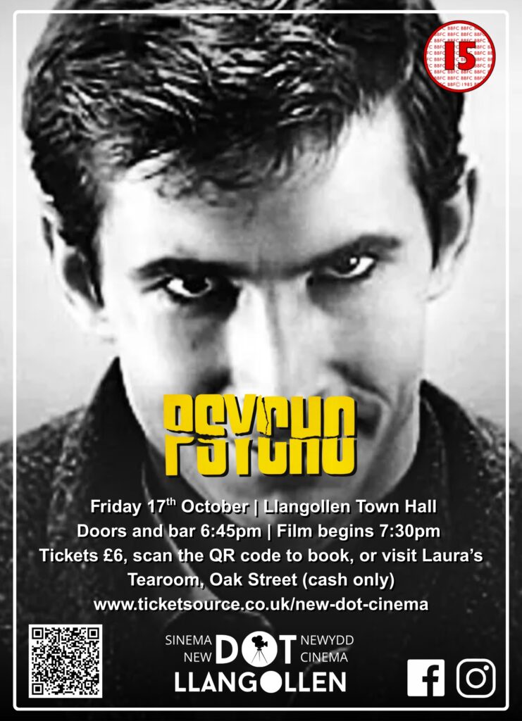 The New Dot Cinema is gearing up for Halloween with this classic Hitchcock horror! Hosted at Llangollen Town Hall, the doors will open at 6:45pm with the movie starting at